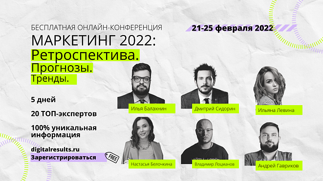 Переходите на сайт конференции «МАРКЕТИНГ 2022: Ретроспектива. Прогнозы. Тренды», знакомьтесь с программой и регистрируйтесь для бесплатного онлайн-участия!